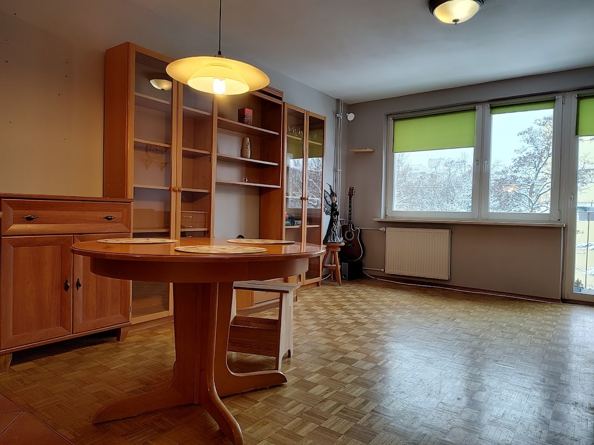 Wynajmę mieszkanie 3-pokojowe o pow. 46,3m2 z kuchnią w aneksie na 2. piętrze w 4.piętrowym budynku na os. Niedźwiadek przy ul. Wojciechowskiego. Nie ma balkonu - jest kratka balkonowa.