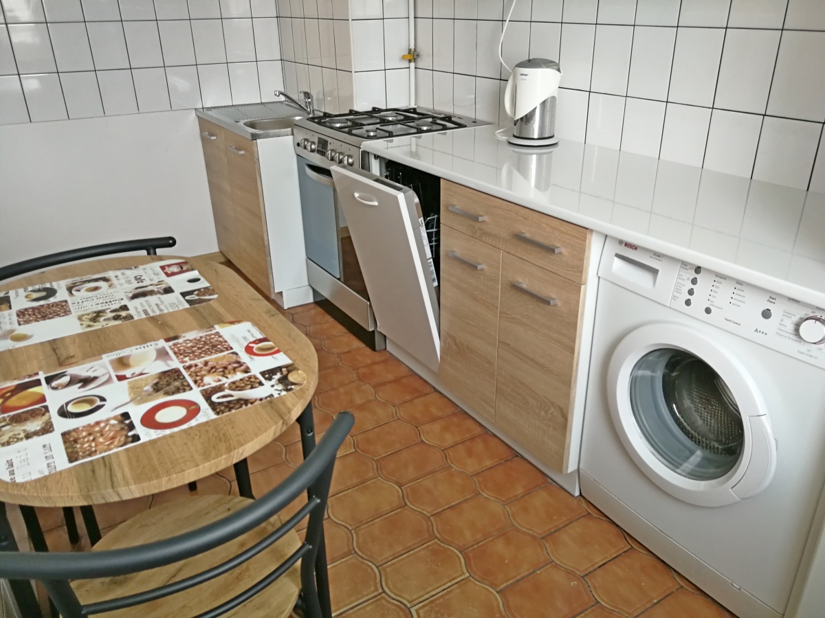 W wyposażeniu: pralka, lodówka, kuchenka gazowa z piekarnikiem, zmywarka, odkurzacz, żelazko, telewizor LCD.