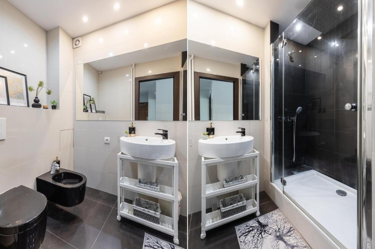Łazienka: Przestronny Prysznic, toaleta, bidet, umywalka, lustro, suszarka do włosów, ręczniki.