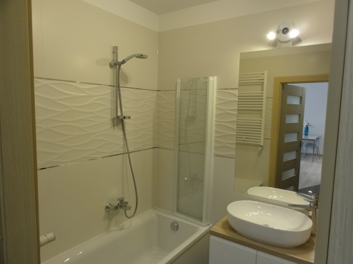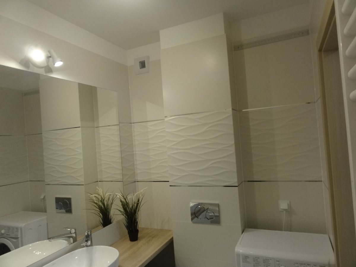- łazienki z wanną i parawanem oraz szafkami i pralką,