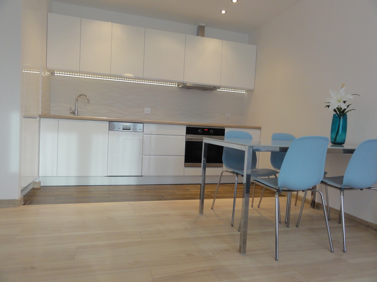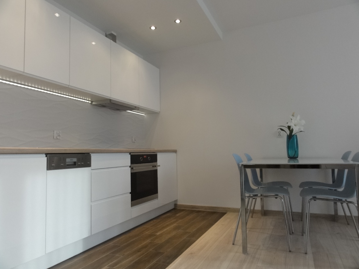 - salonu wyposażonego w rozkładaną sofę połączonego z aneksem kuchennym w pełni wyposażonym w sprzęt AGD (lodówko- zamrażarka, zmywarka, piekarnik, płyta grzewcza z wyciągiem kuchennym),
